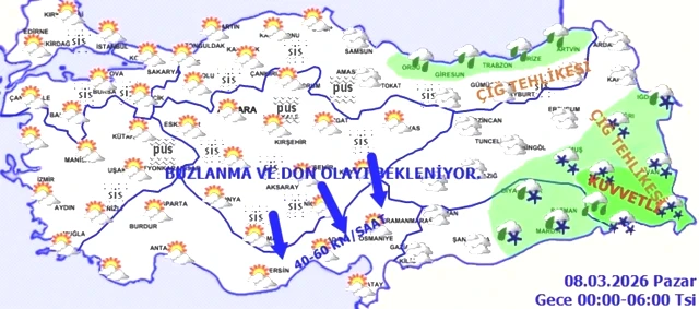 Meteoroloji Genel Müdürlüğü'nün değerlendirmeleri ışığında: Ülkemizin geneli parçalı ve çok bulutlu bir hava görünümüne sahipken, Karadeniz'in kıyı kesimleri (Düzce hariç) ile Mersin, Malatya, Şanlıurfa ve Siirt çevrelerinde yağmur ve sağanak bekleniyor. Orta ve Doğu Karadeniz'in iç kısımları, Doğu Anadolu ve Kayseri, Sivas, Diyarbakır, Mardin ve Batman yörelerinde karla karışık yağmur ve kar yağışı yaşanacağı öngörülüyor. Özellikle Doğu Anadolu'nun güneydoğusu ile Mardin, Batman ve Siirt çevrelerinde yağışların yer yer etkili olması beklenmektedir. Sabah ve gece saatlerinde Marmara, İç Ege, İç Anadolu ve Karadeniz’in iç kesimlerinde sis ve pus olayı gözlemlenmesiyle birlikte, iç ve doğu bölgelerde ise buzlanma ve don olayları bekleniyor. Doğu Karadeniz’in yüksek kesimleri ile Doğu Anadolu'nun eğimli alanlarında çığ riski ve kar erimesi tehlikesinin bulunduğu da vurgulanıyor.